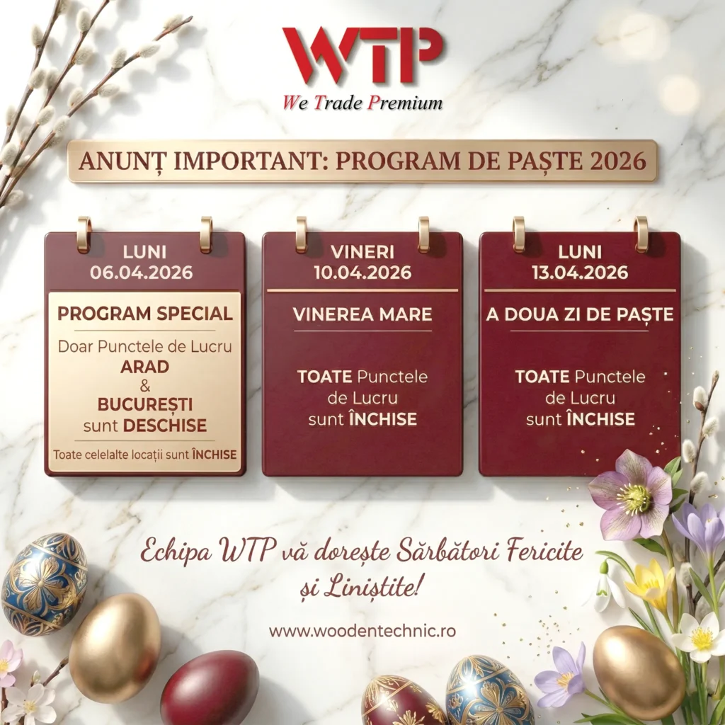 Compania Wooden Technic Prodimpex vă aduce la cunoștință faptul că, în perioada Sărbătorilor Pascale, punctele noastre de lucru vor avea un program special: