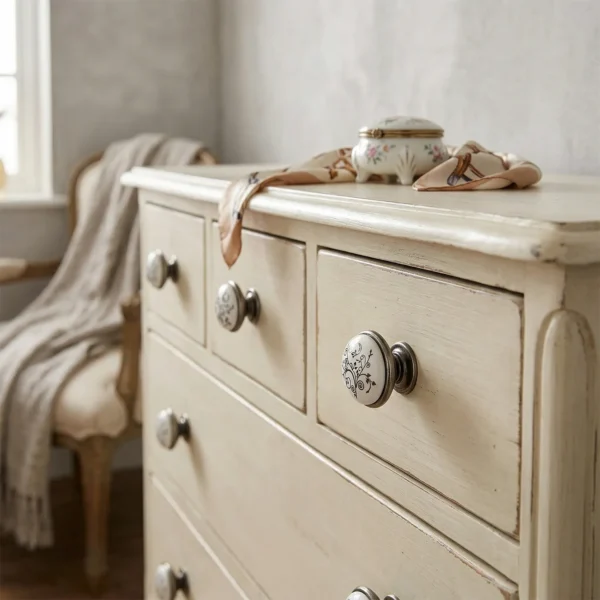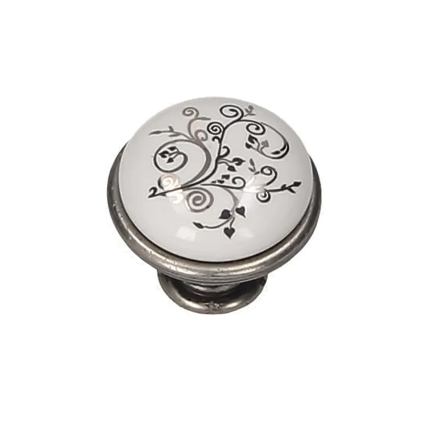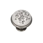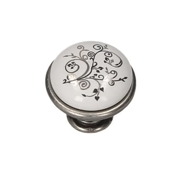 Butonul GP 19-GAB este un accesoriu de feronerie rafinat, ce îmbină căldura finisajului antichizat cu eleganța sofisticată a porțelanului. Designul său este definit de o inserție centrală din porțelan alb, decorată cu un model floral stilizat în nuanțe contrastante de negru (MLK-12), montată pe o bază solidă din alamă antichizată. Cu un diametru de 29 mm și o formă ergonomică, acest buton asigură o priză confortabilă și o prezență vizuală plină de caracter pe frontul mobilierului. Este alegerea ideală pentru a completa piese de mobilier în stil clasic, retro sau vintage, aducând o notă de distincție și rafinament artistic oricărei încăperi.