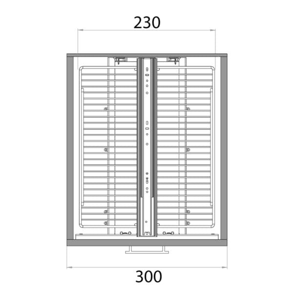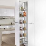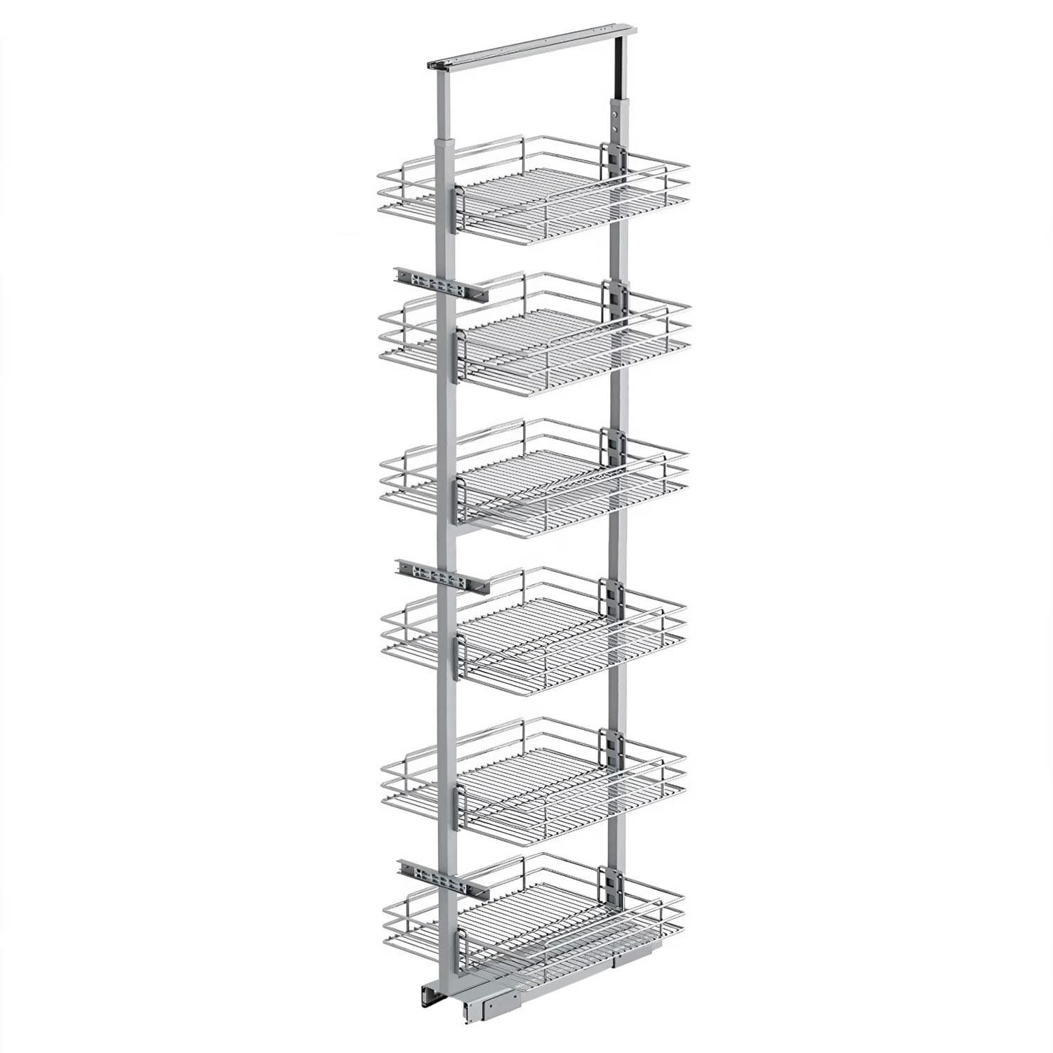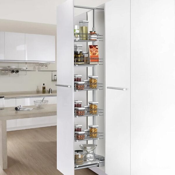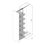 Această coloană cu 6 coșuri, cu înălțimea de 1850 mm și lățimea de 300 mm, oferă o soluție modernă de depozitare în bucătărie, având închidere amortizată pentru un confort sporit. Corpul are culoare argintie, iar structura suport gri deschis, fiind ideal pentru a organiza eficient alimentele.