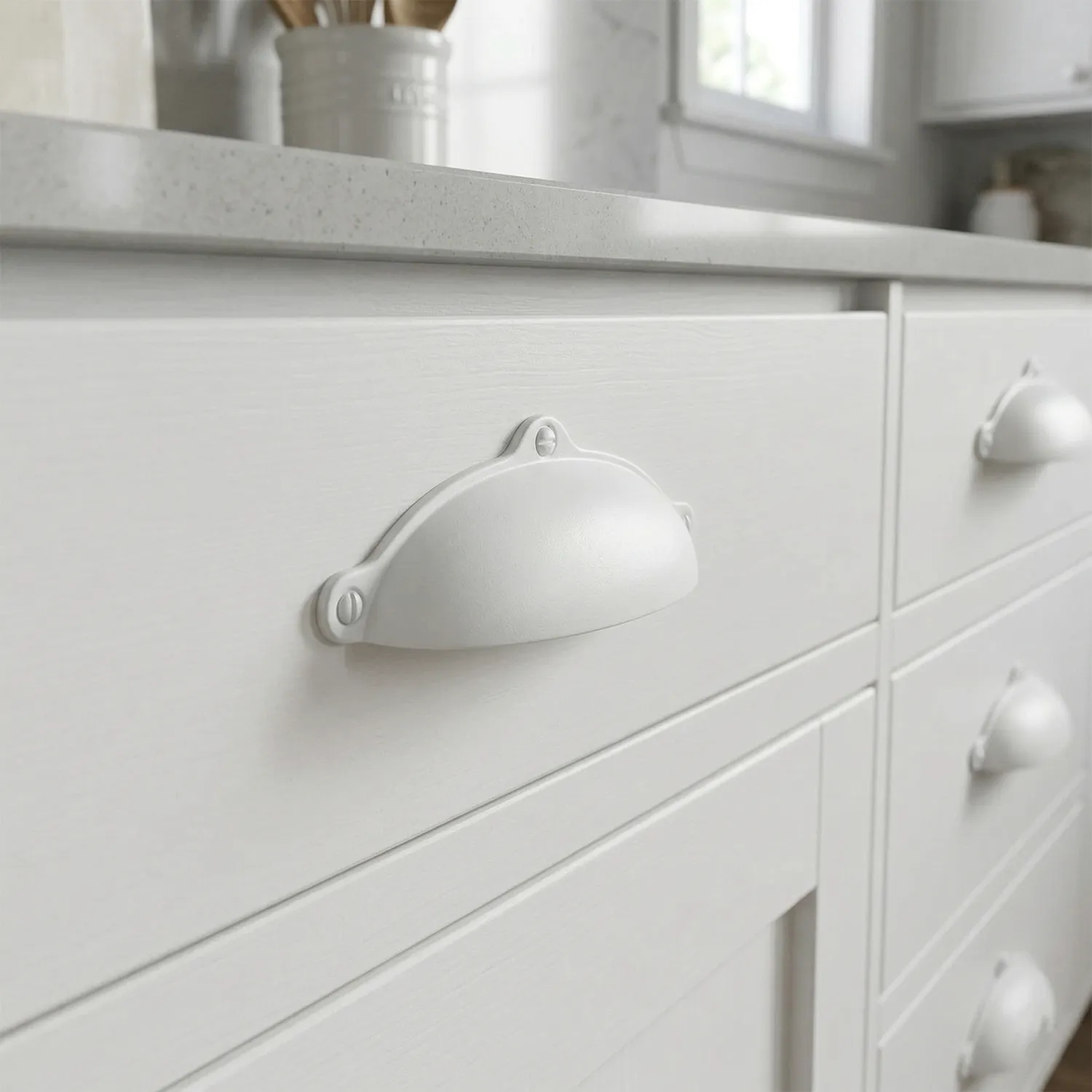 Mânerul Marsala 64 mm este o piesă de feronerie cu un farmec aparte, ce reinterpretează designul clasic tip scoică într-o manieră modernă și elegantă. Forma sa ergonomică, cu o curbură fluidă, este concepută pentru a oferi o prindere naturală și facilă, protejând în același timp suprafața frontului de mobilier. Cu o lungime totală de 99,5 mm și o distanță între găurile de montaj de 64 mm, acest model se remarcă prin cele trei puncte decorative de pe contur, care simulează o fixare tradițională și adaugă un detaliu vizual autentic. Finisajul alb mat oferă un aspect curat, luminos și discret, fiind o alegere ideală pentru mobilierul în stil Provensal, Shabby Chic sau pentru decoruri minimaliste unde se dorește o integrare subtilă.