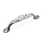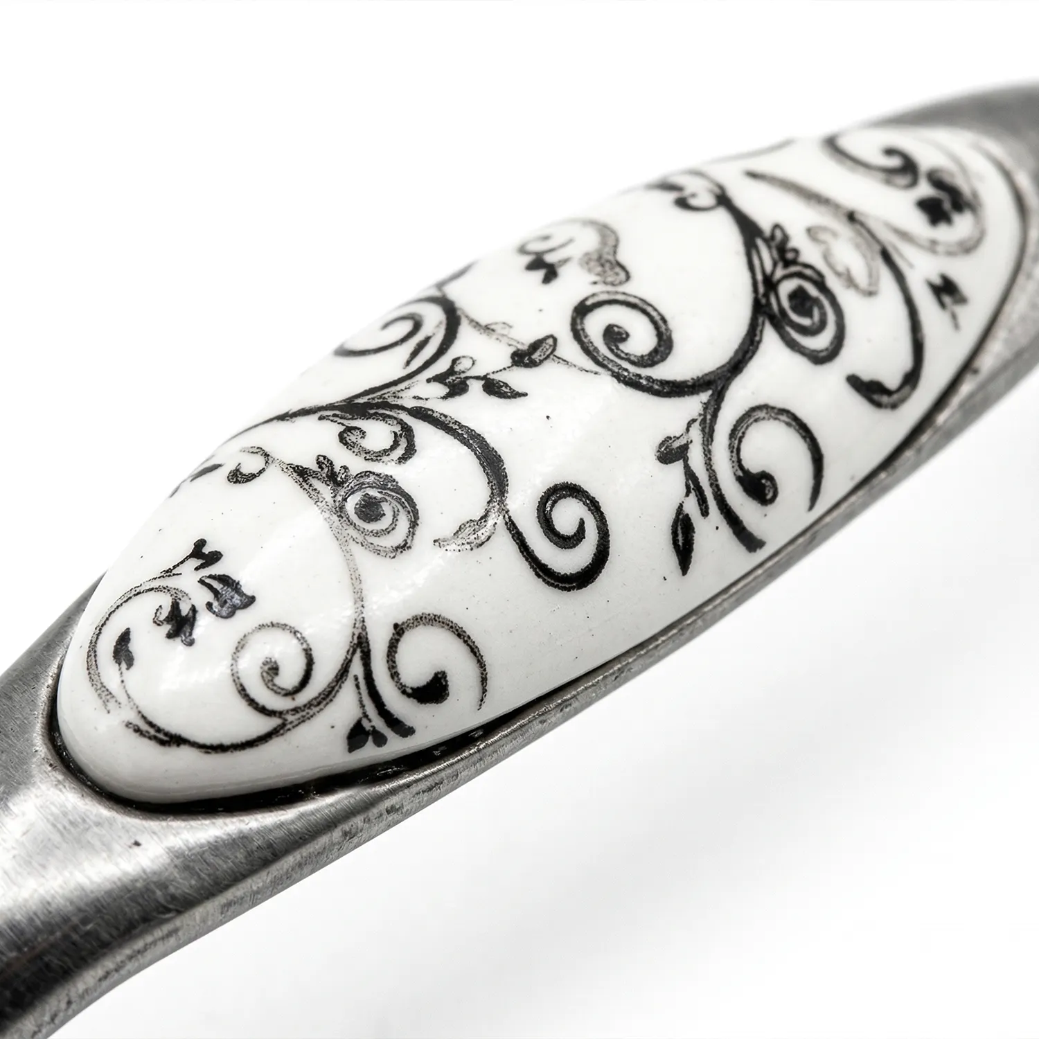 Mânerul UP 19-0096 este o piesă de feronerie rafinată ce îmbină eleganța clasică a porțelanului cu aspectul vintage al nichelului patinat. Designul său este definit de o inserție centrală din porțelan alb, decorată cu un model floral stilizat în nuanțe contrastante de negru (WHT-12), care conferă un aspect dramatic și sofisticat.