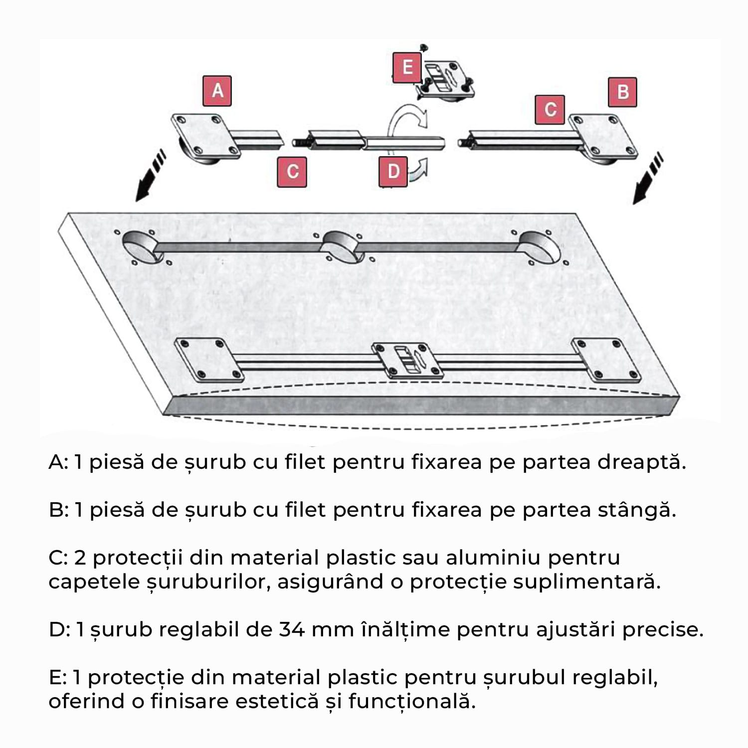 Acest set este esențial pentru asigurarea unei montări corecte și stabile a ușilor, prevenind deformările și contribuind la o utilizare pe termen lung a produsului. Ideal pentru aplicații în care este necesară o fixare solidă și estetică.